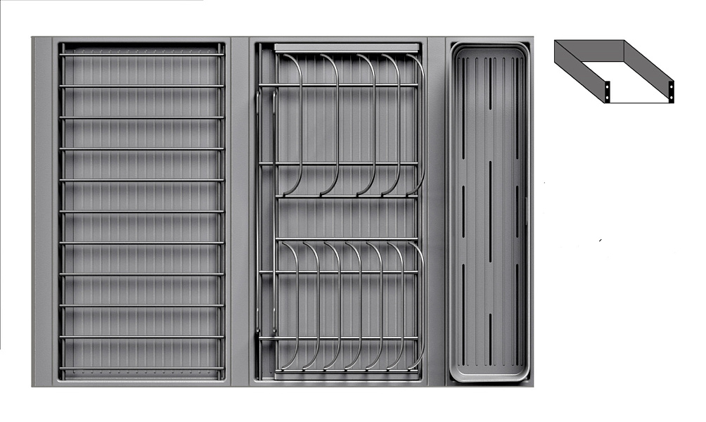 1 для столовых приборов (состоит из: 1 х емкость пластиковая 400 х 100 х 120 мм, 1 х поддон пластиковый 423 х 124 мм)