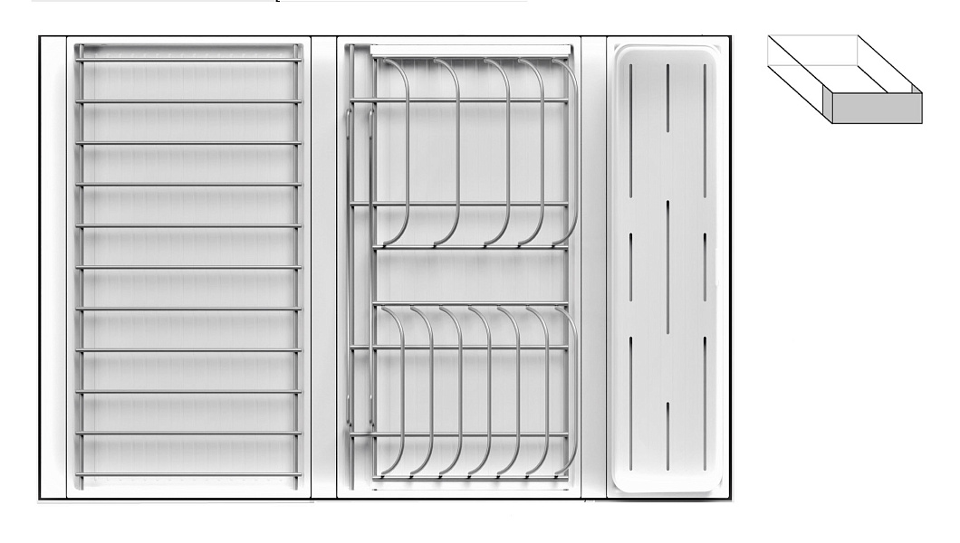 1 для столовых приборов (состоит из: 1 х емкость пластиковая 400 х 100 х 120 мм, 1 х поддон пластиковый 423 х 124 мм)