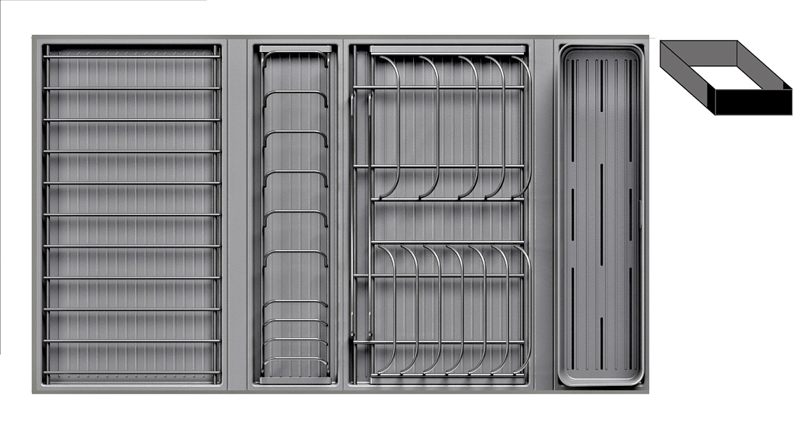 1 для столовых приборов (состоит из: 1 х емкость пластиковая 400 х 100 х 120 мм, 1 х поддон пластиковый 423 х 124 мм)