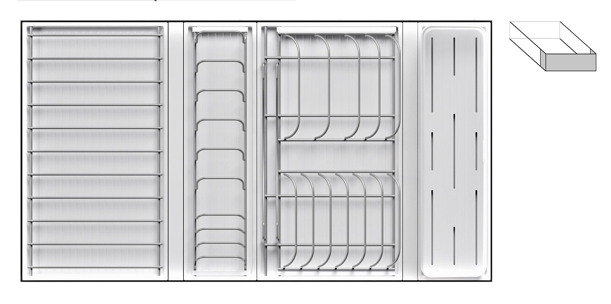 1 для столовых приборов (состоит из: 1 х емкость пластиковая 400 х 100 х 120 мм, 1 х поддон пластиковый 423 х 124 мм)